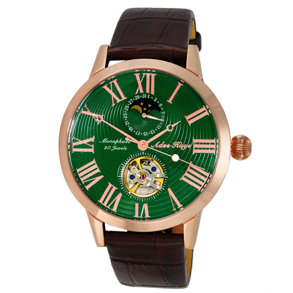 Shophq Jewelryhq Jewelryhq Wellness Network Adee Kaye Men S 47mm Automatic Open Heart Day Night Green Dial Rose Tone Case Leather Strap Watch Shophq